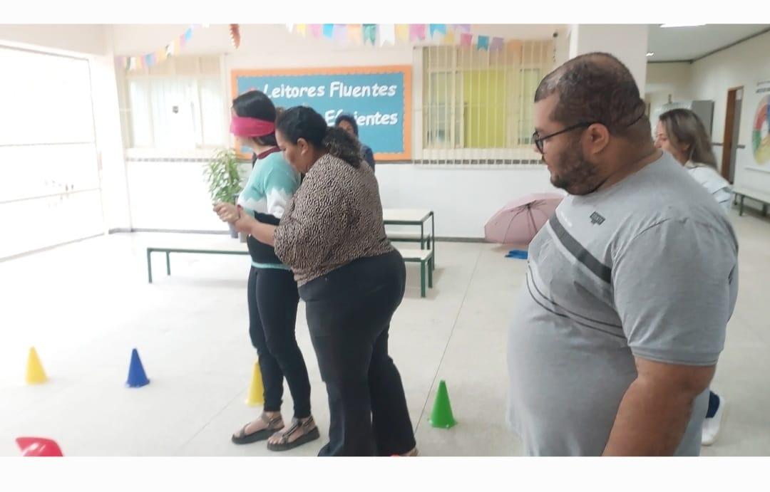 No dia 3 de julho, a professora de Educação Física Marcella conduziu a atividade sensorial “Sentir para Compreender”, direcionada às cuidadoras Fabiana, Jocimara, Mariana e Josiana. A dinâmica em formato de circuito com obstáculos simulou limitações físicas e sensoriais enfrentadas por estudantes com deficiência, promovendo empatia, respeito e escuta ativa entre os participantes.