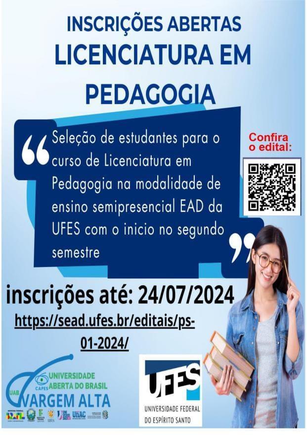 A Universidade Federal do Espírito Santo (UFES) está com inscrições abertas para o curso de Licenciatura em Pedagogia na modalidade semipresencial, voltado para estudantes de Vargem Alta e região. Esta oportunidade é oferecida em parceria com a Universidade Aberta do Brasil (UAB) e é parte do compromisso de ampliar o acesso à educação superior.