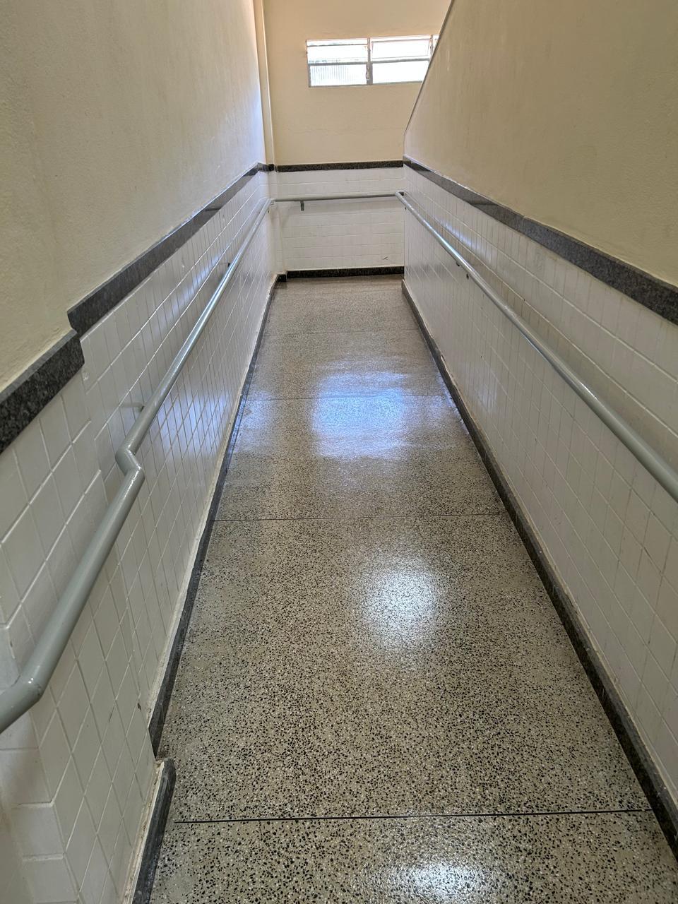 O serviço não fazia parte do projeto original da reforma, mas foi incluído para eliminar a poeira e melhorar as condições de uso dos espaços.