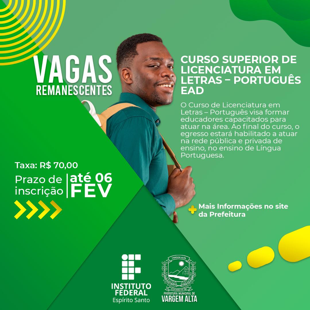 O Polo da Universidade Aberta do Brasil (UAB) de Vargem Alta informa, sobre vagas remanescentes para o curso de Licenciatura em Letras – Português, oferecidos pelo Instituto Federal do Espírito Santo (Ifes), na modalidade à distância (EAD). O período de inscrição é de 16 de janeiro a 06 de fevereiro e a taxa no valor de R$ 70,00.