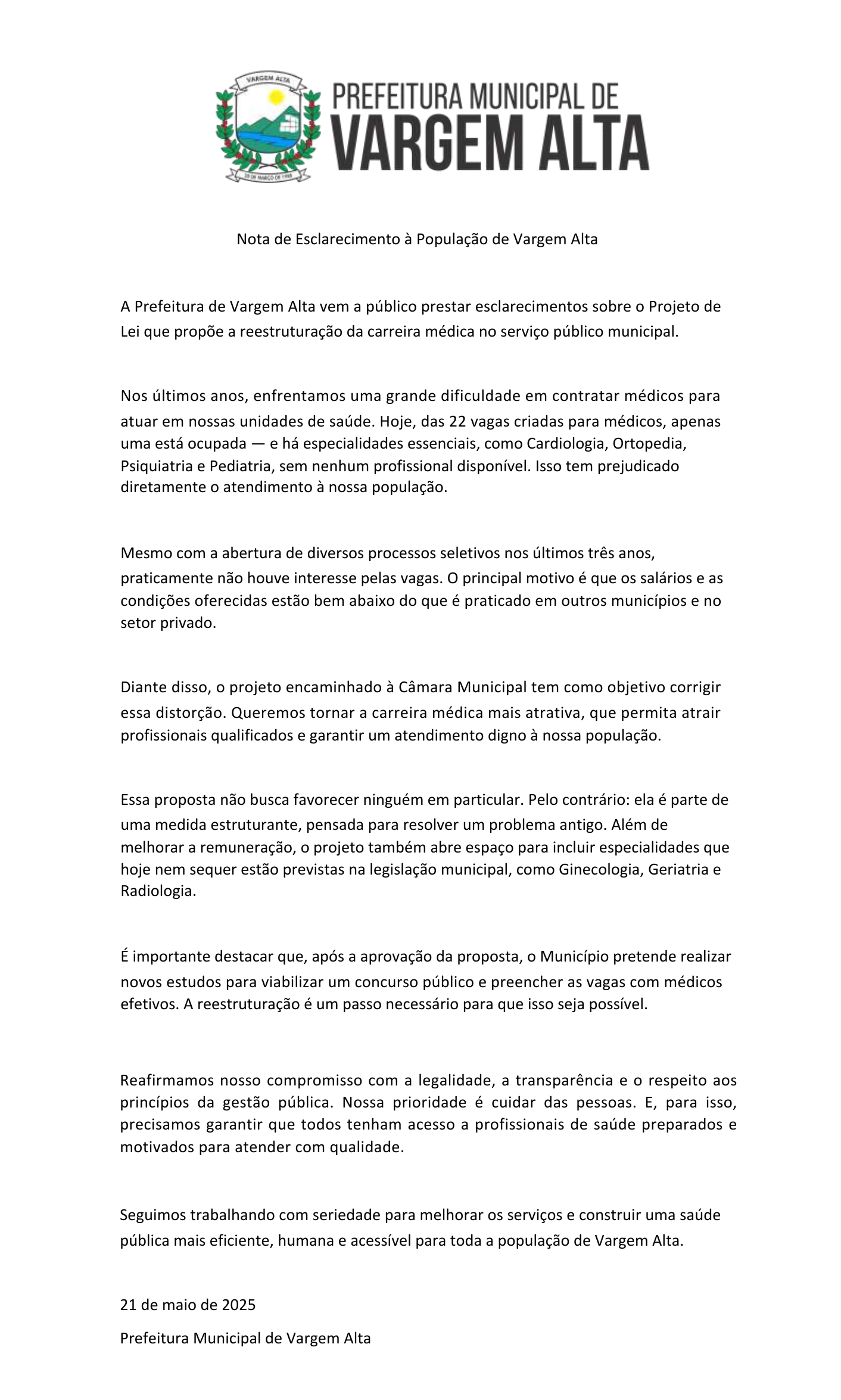 Um projeto de lei encaminhado pela Prefeitura de Vargem Alta à Câmara Municipal tem provocado forte repercussão política no município. A proposta reestrutura a carreira médica no serviço público e cria um grupo de remuneração exclusivo para a categoria. O que acentuou o debate foi o fato de, atualmente, apenas uma médica efetiva estar em atividade.