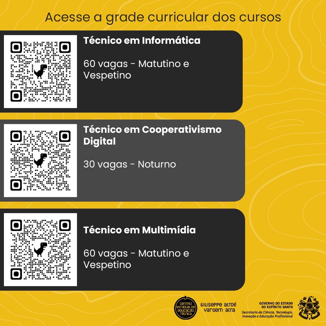 Para conferir as grades curriculares e os detalhes dos cursos, basta acessar os QR Codes disponíveis nos materiais de divulgação.