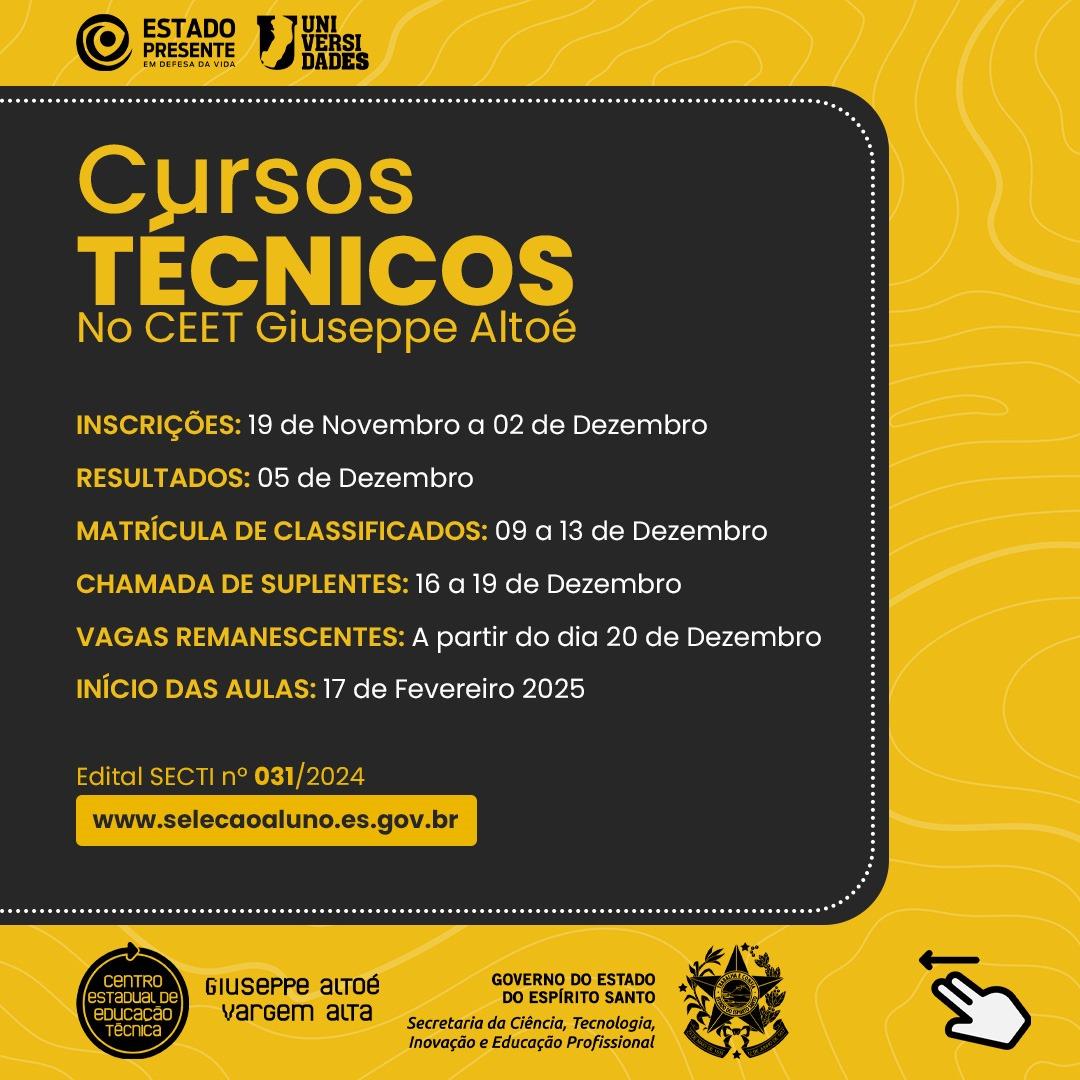 O Centro Estadual de Educação Técnica (CEET) Giuseppe Altoé, Boa Esperança, no distrito de Jaciguá , em Vargem Alta, está com inscrições abertas para cursos técnicos gratuitos, uma oportunidade para quem busca qualificação profissional de excelência. As inscrições poderão ser realizadas entre 19 de novembro e 02 de dezembro, permitindo que estudantes e trabalhadores ampliem suas chances de sucesso no mercado de trabalho.